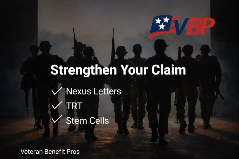 We help veterans navigate the VA system with precision and credibility through professional medical evaluations, Nexus Letters, and clinical services including Testosterone Replacement Therapy (TRT) and regenerative treatments such as stem cell therapy. Our approach is built to support clear service connection, stronger claims, and better long-term outcomes.